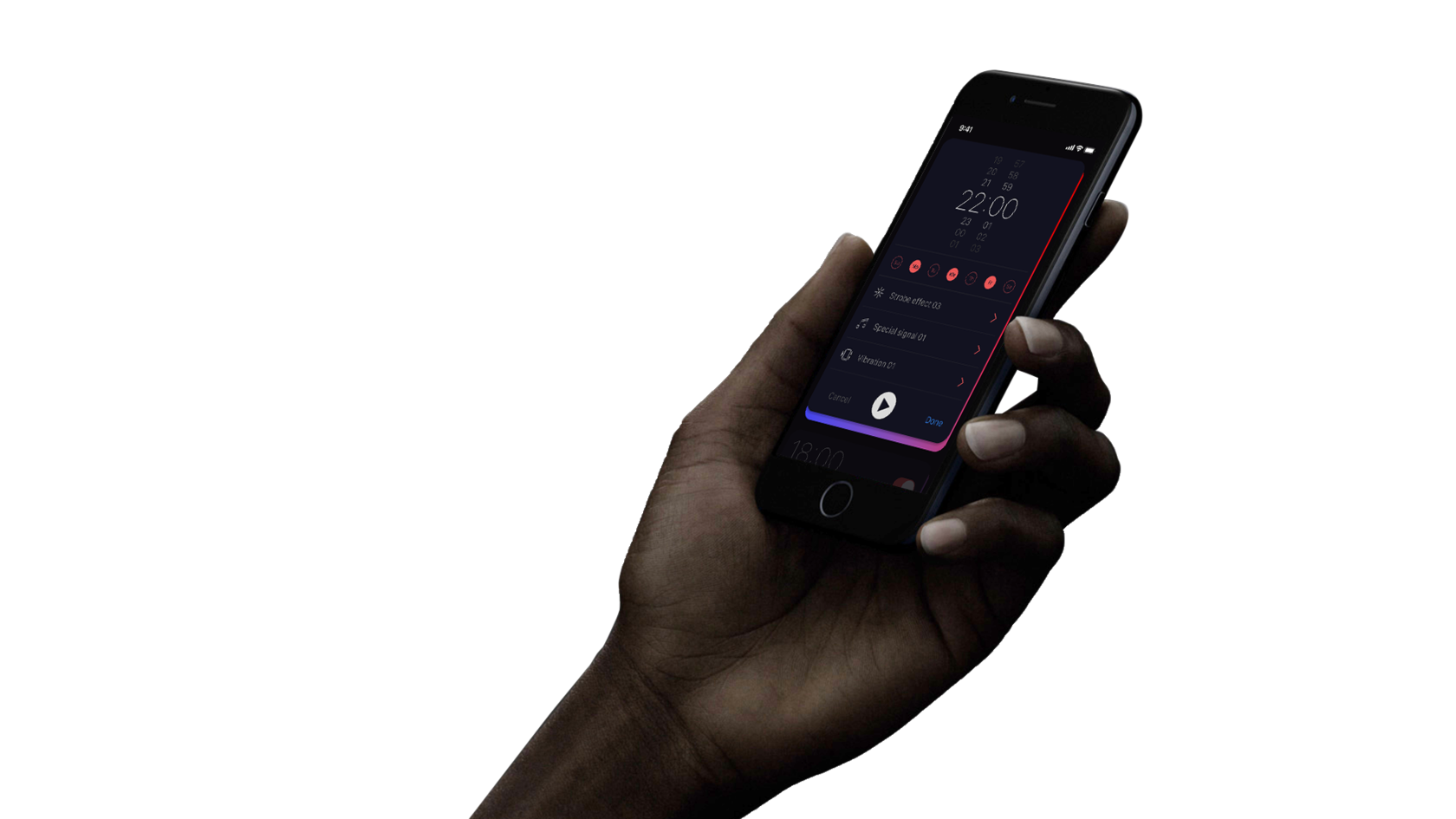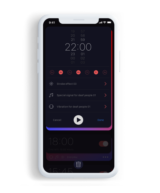 Choosing an alarm clock a person is bound to face several problems which further complicate process such as the high price of 50 - 100 Euros as well as waiting for delivery or the lack of a specialised store nearby. Continuing the research we got into the problem deeper and found a lot of reviews and comments in various forums around the world, where people with similar problems ask if there are any special applications with advanced vibration or flash settings. No one gives a definite answer since at the moment there is no satisfactory solution on the market. Comparing applications at Apple Store and Google Play we have identified a number of problems faced by the user such as: lack of advanced vibration settings, inability to record vibration, lack of flexible control of light and sound signals, difficult interface and path to vibration settings, embedded advertising and price.